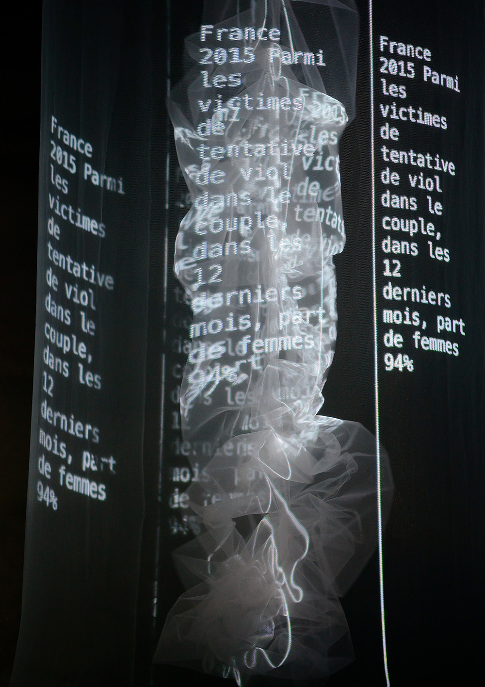 Dans un environnement sonore brumeux, des mobiles en forme de méduses se font support de données projetées. Leur mise en mouvement et leur affichage sont pilotés par un script en Python conçu par les artistes. Ce code laisse apparaître des variables telles que pays, années, statistiques, femmes, ainsi que des commentaires évoquant directement les inégalités traitées. Le script utilise un protocole habituellement dédié aux transmissions Internet rapides, ici détourné pour transmettre les données vers un simple écran de type terminal Unix, qui sert d’espace d’affichage. Celui-ci fait défiler les données, projetées sur les mobiles. En parallèle, un programme développé en Max/MSP, un logiciel musical de programmation graphique, reçoit les mêmes messages et génère le paysage sonore de l’installation.