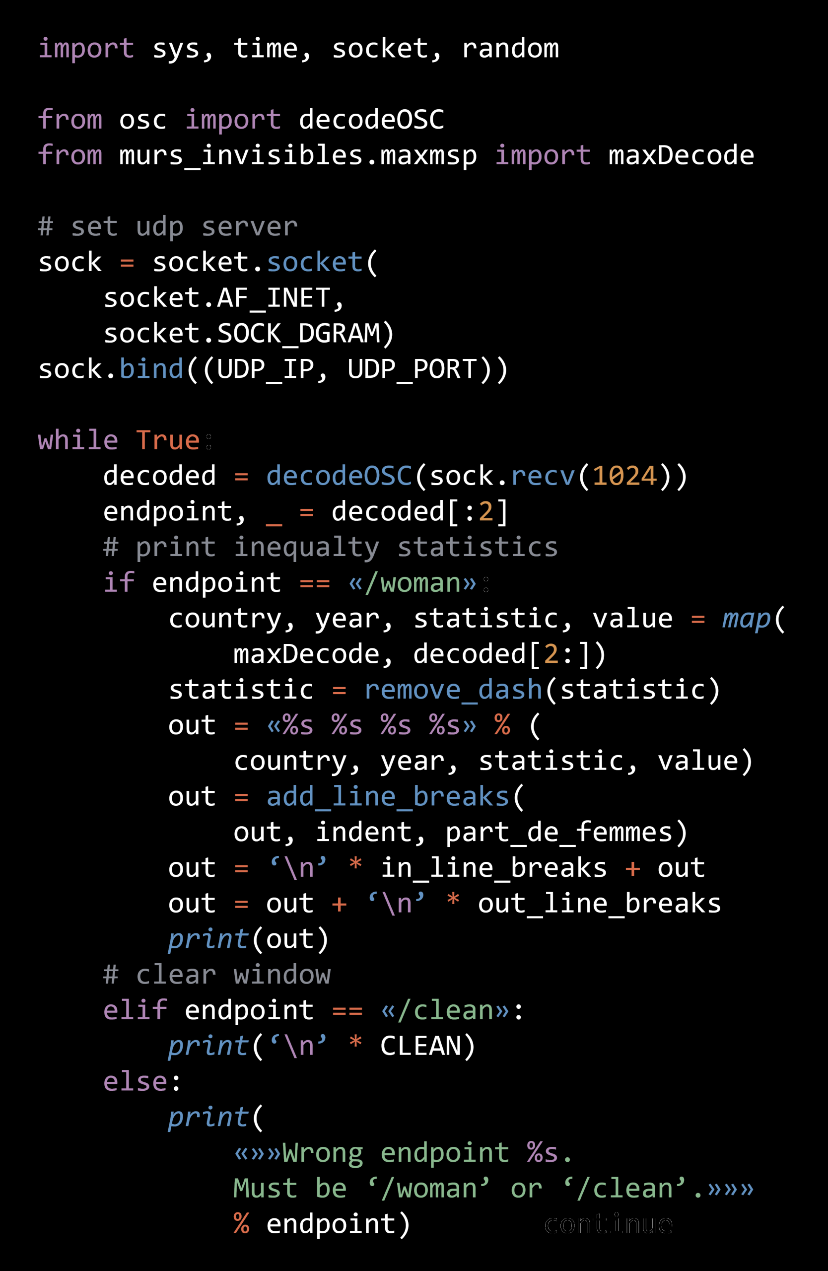 Une boucle infinie organise les 25 minutes des trois tableaux – Disparitions, Écarts, Violences – dont les séquences reviennent et se transforment continuellement. Cet extrait de code illustre comment des outils numériques courants peuvent être réinvestis dans les arts vivants afin de coordonner son et image, et comment ils peuvent devenir matériaux artistiques et militants.