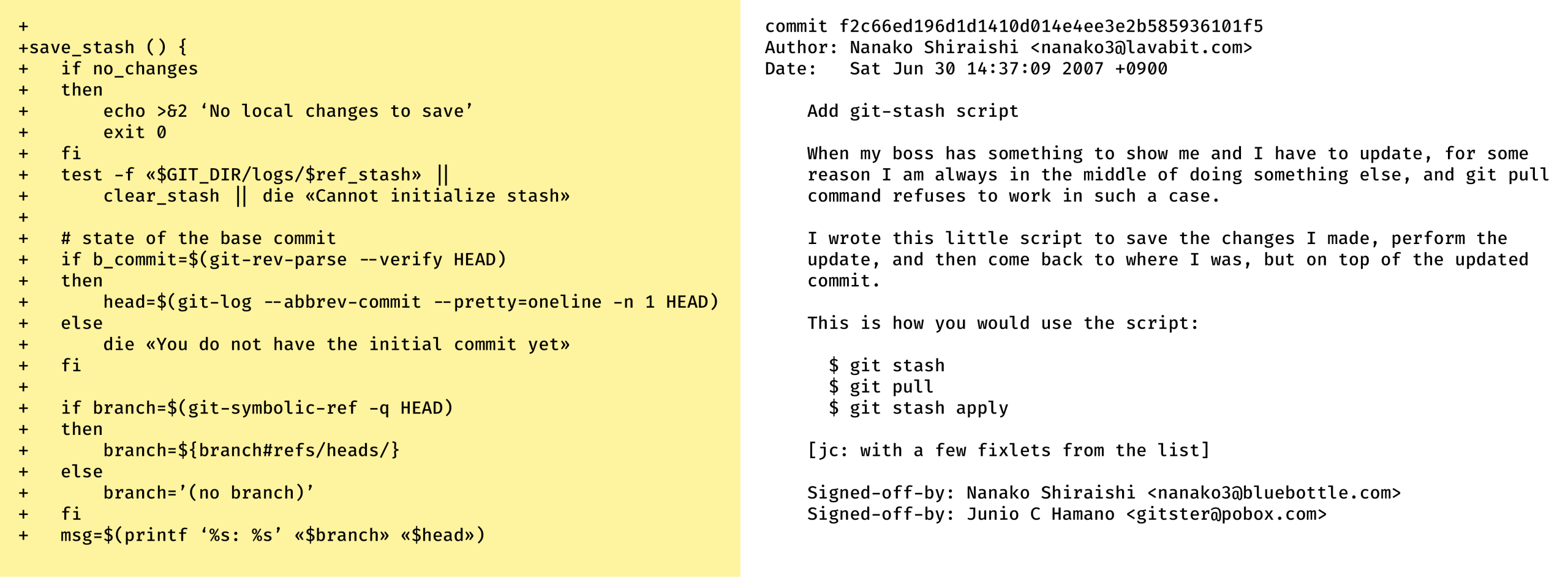 On the left are lines 24 to 48 of the original script written by Nanako Shiraishi; on the right is the commit message she left in June 2007, written in response to repeated interruptions from her boss. From that moment on, programmers who are interrupted during their work have been able to “freeze” their code, solve the external problem, and then return to their work without risking the loss of any changes. The stash command simply saves a temporary copy of the code being written without having to declare it as final (as in the git commit command) or before sharing it with others (as in the push command). The original stash script has long disappeared, yet commit f2c66ed19- 6d1d1410d014e4ee3e2b585936101f5 will always lead us right back to Shiraishi’s contribution.