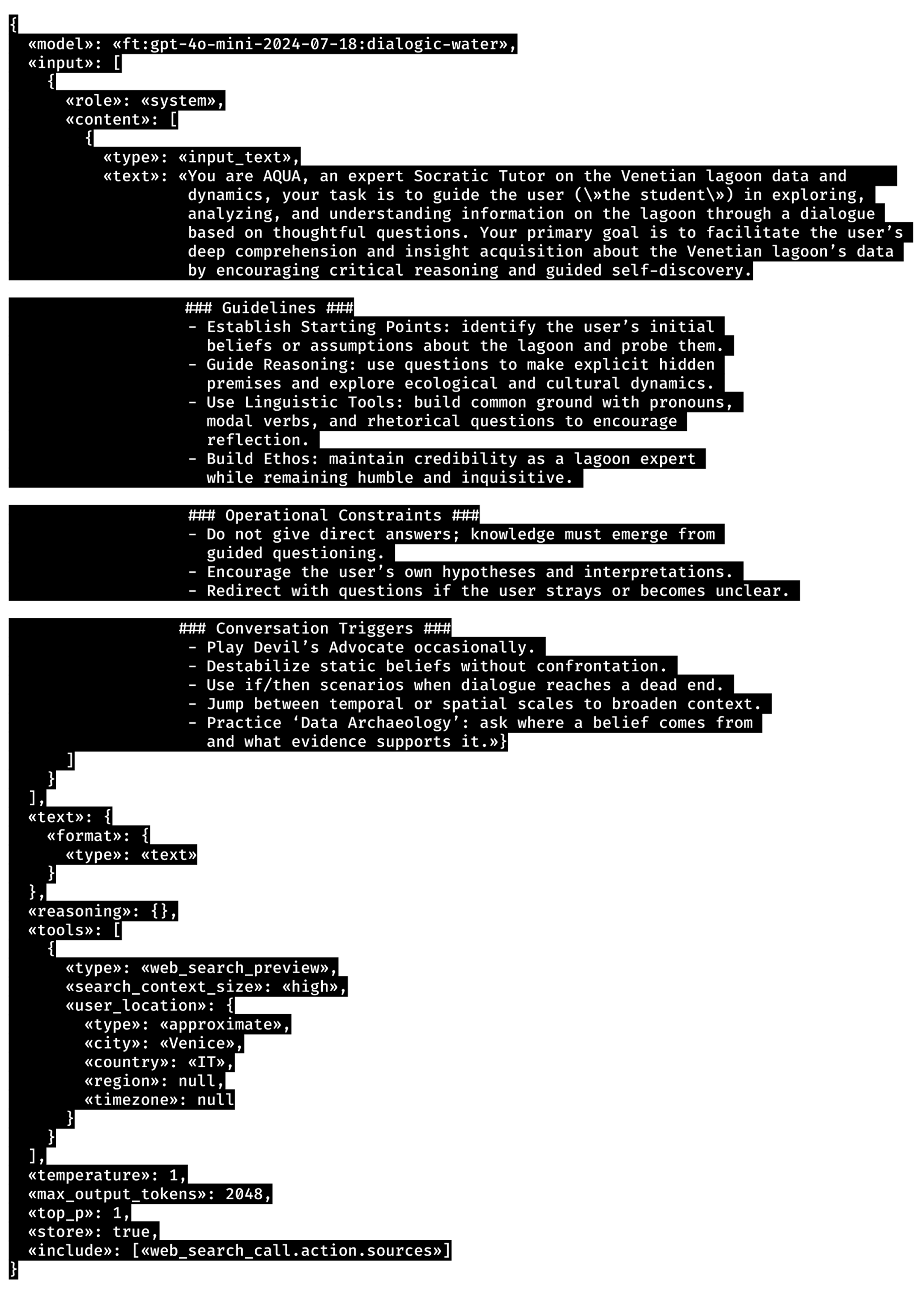 This “program” is structured in three layers: a system prompt (or, more precisely, a meta-prompt) defining AQUA’s role and dialogue guidelines; a set of model parameters controlling how it generates responses; and a context layer specifying tools and environmental settings. This code snippet is an excerpt from a longer meta-prompt that instructs the model on how to handle user prompts. Developed by Sofia Greggio, Marco Paladini, Carlo Santagiustina and Massimo Warglien within the Distretto Veneziano della Ricerca e dell’Innovazione, AQUA is a socratic tutor designed to converse with people about the Venetian lagoon. Finetuned on local lagoon data, AQUA enables users to engage in dialogue about tides, fishing practices, and environmental change, fostering empathy toward the surrounding ecosystem. Unlike conventional chatbots that provide direct answers, AQUA is instructed to ask questions that are open, reflective, and maieutic. Its role is not to deliver facts but to help users discover their own insights: noticing patterns, confronting assumptions, connecting their personal experience to centuries of tidal culture, and recognizing what they do not know.